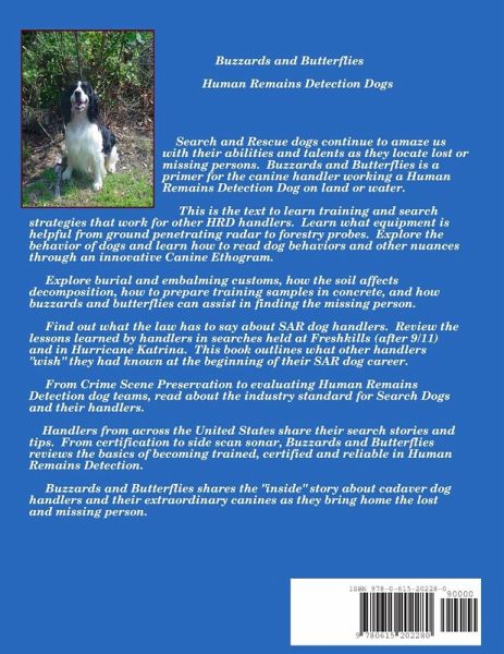 Search and Rescue dogs continue to excel with their abilities and talents as they locate missing persons. Buzzards and Butterflies is a primer for the canine handler working a Human Remains Detection Dog on land or water. Included are training and search strategies that are working for other HRD handlers. Find out what equipment is helpful from ground penetrating radar to forestry probes. Learn how to read dog behaviors through a Canine Ethogram. Explore a compilation of hints, missions, techniques, and recommendations with the "rest of the story" for cadaver dog handlers. Find out what the law has to say about SAR dog handlers and the lessons learned by handlers in high profile searches. From Crime Scene Preservation to evaluating Human Remains Detection dog teams, read about the industry standard for Search Dogs and their handlers. Buzzards and Butterflies shares the "inside" story about cadaver dog handlers and their extraordinary canines as they bring home the missing person.
