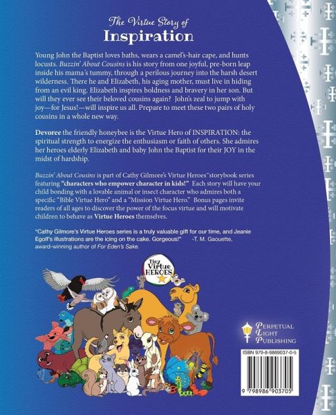 Imagine the young John the Baptist: a boy who loves baths, wears a camel's hair cloak, and hunts locusts. Buzzin' About Cousins plunges readers into the JOY of a visit between Mary, Elizabeth, and their unborn sons, but soon after finds us venturing into a harsh wilderness. There elderly Elizabeth inspires boldness and bravery in her son. But will they ever see their beloved cousins again? John's zeal to jump with joy-for Jesus!-will inspire us all! Prepare to meet these two pairs of holy cousins in a whole new way. Devoree the friendly honeybee is the Virtue Hero of INSPIRATION: the spiritual strength to energize the enthusiasm or faith of others. She admires her heroes elderly Elizabeth and baby John the Baptist for their JOY in the midst of hardship. Buzzin' About Cousins is part of Cathy Gilmore's Virtue Heroes(TM)storybook series featuring "characters who empower character in kids!". Each story will have your child bonding with a lovable animal or insect character who admires a both a specific "Bible Virtue Hero" and a "Mission Virtue Hero". Bonus pages in each volume invite readers of all ages to discover the power of the focus virtue and will motivate children to behave as virtue heroes themselves. "Cathy Gilmore's Virtue Heroes series is a truly valuable gift for our time, and Jeanie Egolf's illustrations are the icing on the cake. Gorgeous!" - T. M. Gaouette, award-winning author of For Eden's Sake.