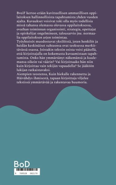 BveiF kertoo erään kuvitteellisen ammatillisen oppilaitoksen hallinnollisista tapahtumista yhden vuoden ajalta. Kuvaukset voisivat toki olla myös todellisia missä tahansa olemassa olevassa oppilaitoksessa, ovathan toiminnan organisointi, strategia, opettajat ja opiskelijat ongelmineen, talousarvio jne. normaalia oppilaitoksen arjen toimintaa. Työyhteisöt muodostuvat yksilöistä, joten henkilöt ja heidän keskinäiset suhteensa ovat teoksessa merkittävässä osassa. Joistakin tekstin osista voisi päätellä, että kirjoittajalla on kokemusta kuvaamistaan tapahtumista. Onko hän ymmärtänyt näkemänsä ja kuulemansa oikein vai väärin? Vai kirjoittaako hän niin kuin kirjoittaa vain tekijän vapaudella? Se jääköön lukijan ratkaistavaksi. Aiempien teostensa, Kuin hiekalle rakennettu ja Häivähdys ihmisestä, tapaan kirjoittaja viljelee tekstissä ymmärtävää ja rakentavaa huumoria.