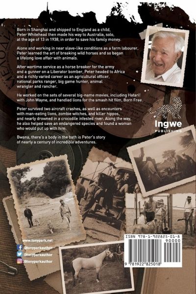 Bwana, There's a Body in the Bath! By Peter Whitehead with Tony Park Born in Shanghai and shipped to England as a child, Peter Whitehead then made his way to Australia, solo, at the age of 13 in 1938, in order to save his family money. Alone and working in near slave-like conditions as a farm labourer, Peter learned the art of breaking wild horses and so began a lifelong love affair with animals. After wartime service as a horse breaker for the army and a gunner on a Liberator bomber, Peter headed to Africa and a richly varied career as an agricultural officer, national parks ranger, big game hunter, animal wrangler and rancher. He worked on the sets of several big-name movies, including Hatari! with John Wayne, and handled lions for the smash hit film, Born Free. Peter survived two aircraft crashes, as well as encounters with man-eating lions, zombie witches, and killer hippos, and nearly drowned in a crocodile infested river. Along the way, he also helped save an endangered species and found a woman who would put up with him. Bwana, There's a Body in the Bath! is Peter's story of nearly a century of incredible adventures. Tony Park is the author of 20 thriller novels set in Africa and eight non-fiction biographies. In Bwana, There's a Body in the Bath, he teams up with a man who has truly lived a life full of adventure, spanning nearly 100 years and several continents. For lovers of Africa, history, and true life adventure.