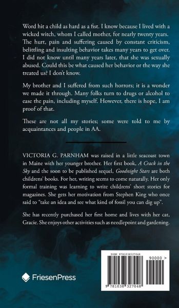 Victoria G. Parnham is from Maine where the story unfolds. As a child, her greatest pleasure was reading books and her favorite writer at that time was Grace Livingston Hill. "I thought to myself, I would love to be a writer. About twenty years ago, I took a writing course. Writing is the best way I have of expressing myself and for me, it just flows. So, to start, I keep little notes on index cards/post its and I don't actually keep them in much order. When I undertook this project, I laid them all out on a table and picked which ones I could use in my book and which ones could be saved for future use. Incidentally, my instructor stated that I had too much information and had more than enough for a second book. I got my idea from the commercial I saw once, 'words hit a child as hard as a fist.' I built it from there." Stephen King once said to take an idea and see what kind of fossil you can dig up. Having talked mostly to adults who were the victims of child abuse - including verbal and mental abuse - she has heard of several instances where they would rather have been struck or beaten than to endure the constant criticism and humiliation of cruel, hateful, belittling words in addition to being told they were 'wrong' all the time, being told they were dumb or stupid and everything they did or said was wrong. A Crack in the Sky is the author's debut novel.