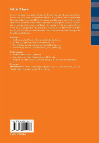 In einer einfachen und praxisorientierten Darstellung ohne theoretischen Ballast bietet dieses Buch einen umfassenden Einblick in alle Bereiche des kaufmännischen Denkens. Insbesondere dem IT-Berufler in der Ausbildung, aber auch in der beruflichen Praxis, vermittelt es mit seinen zahlreichen Praxisbeispielen aus der IT-Branche den notwendigen betriebswirtschaftlichen Hintergrund und die Management-Denkweise für ein erfolgreiches wirtschaftliches Handeln in der Marktwirtschaft. Das Buch eignet sich auch bestens für Bachelor- und FH-Studierende zum Einstieg in die Betriebswirtschaftslehre.