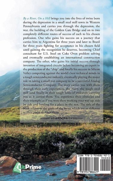 By a River, On a Hill brings you into the lives of twins born during the depression in a small steel mill town in Western Pennsylvania and carries you through the depression, the war, the building of the Golden Gate Bridge, and on to two completely different routes of success of each to his chosen profession. One who gains his success on a journey that carries him to Argentina for three years and later to Brazil for three years fighting for acceptance in his chosen field until gaining the recognition he deserves, becoming Chief consultant for U.S. Steel on Coke Oven problem solving and eventually establishing an international construction company. The other, who gains his initial success through invention of integrated circuits before becoming an expert in the production of the ?chip? and finally his success in Silicon Valley competing against the world's best technical minds in a tough semiconductor industry, eventually playing the major role in taking a small test company to be a successful Analog Semiconductor Company. The story carries you with them through their early experiences, the Navy, the tough steel mills, and finally in their tough fields of endeavor; carrying you as it carried them. You experience their obstacles and their triumphs as if you were there working your way up, side by side and battling for a place in the sun. The title of the book relates to the goals of the twins which are as different as their paths to reach them.