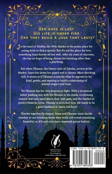 In the land of Taletha, the Wife Market is the prime place for young lords to find a spouse...but not the place for love. Something Inara knows all too well. After six years of rejection, she has no hope of being chosen for anything but a plaything. When the future ruler of Taletha arrives at the Market, Inara is chosen. More shocking still, Dhamar is exactly what he appears to be: kind, gentle, and willing to build a relationship of mutual respect and trust. Yet Dhamar has his own demons to fight. With a tyrannical father pushing for war with the erians, a scheming council, and the burden to protect those he loves, Dhamar is stretched thin. He wants to be a good husband to his wife, but how? Thrown together by chance, will breaking down their walls reveal something beautiful, or leave only shattered pieces behind?