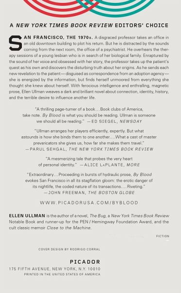 A New York Times Notable Book of the Year San Francisco, the 1970s. A disgraced professor takes an office in an old downtown building to plot his return. But he is distracted by the sounds coming from the next room, the office of a psychiatrist. He overhears the therapy sessions of a young lesbian who is in search of her adoptive family. Enraptured by the sound of her voice and obsessed with her story, the professor takes up the patient's quest as his own and discovers the disturbing truth about her origins. As he sends each new revelation to the patient---disguised as correspondence from an adoption agency---she is energized by the information, but finds herself unmoored from everything she thought she knew about herself. With ferocious intelligence and enthralling, magnetic prose, Ellen Ullman's By Blood is a dark and brilliant novel about connection, identity, history, and the terrible desire to influence another life.