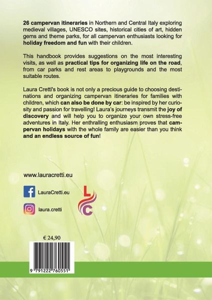 26 campervan itineraries in Northern and Central Italy exploring medieval villages, UNESCO sites, historical cities of art, hidden gems and theme parks, for all campervan enthusiasts looking for holiday freedom and fun with their children.This handbook provides suggestions on the most interesting visits, as well as practical tips for organizing life on the road, from car parks and rest areas to playgrounds and the most suitable routes.Laura Cretti's book is not only a precious guide to choosing destinations and organizing campervan itineraries for families with children, which can also be done by car: be inspired by her curiosity and passion for travelling! Laura's journeys transmit the joy of discovery and will help you to organize your own stress-free adventures in Italy. Her enthralling enthusiasm proves that campervan holidays with the whole family are easier than you think and an endless source of fun!