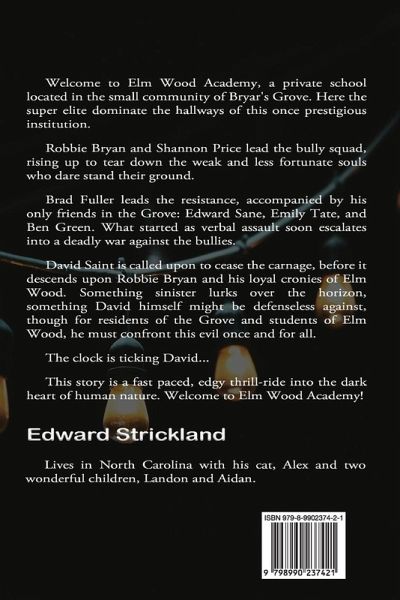 Welcome to Elm Wood Academy, a private school located in the small community of Bryar's Grove. Here the super elite dominate the hallways of this once prestigious institution. Robbie Bryan and Shannon Price lead the bully squad, rising up to tear down the weak and less fortunate souls who dare stand their ground. Brad Fuller leads the resistance, accompanied by his only friends in the Grove: Edward Sane, Emily Tate, and Ben Green. What started as verbal assault soon escalates into a deadly war against the bullies. David Saint is called upon to cease the carnage, before it descends upon Robbie Bryan and his loyal cronies of Elm Wood. Something sinister lurks over the horizon, something David himself might be defenseless against, though for residents of the Grove and students of Elm Wood, he must confront this evil once and for all. The clock is ticking David... This story is a fast paced, edgy thrill-ride into the dark heart of human nature. Welcome to Elm Wood Academy!