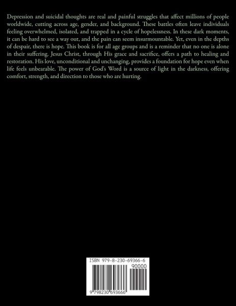 Depression and suicidal thoughts are real and painful struggles that affect millions of people worldwide, cutting across age, gender, and background. These battles often leave individuals feeling overwhelmed, isolated, and trapped in a cycle of hopelessness. In these dark moments, it can be hard to see a way out, and the pain can seem insurmountable. Yet, even in the depths of despair, there is hope. This book is for all age groups and is a reminder that no one is alone in their suffering. Jesus Christ, through His grace and sacrifice, offers a path to healing and restoration. His love, unconditional and unchanging, provides a foundation for hope even when life feels unbearable. The power of God's Word is a source of light in the darkness, offering comfort, strength, and direction to those who are hurting.
