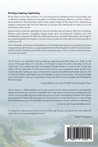 By His Grace is more than a memoir-it's a harrowing yet triumphant journey of survival, faith, and unrelenting courage. Against an international backdrop of power, affluence, and fear, child sex abuse prevention advocate Katy Sudano takes readers deep into the heart of her extraordinary escape-a desperate flight from the darkness of her past with nothing but her baby in her arms and a fierce will to survive. Determined to break the generational cycle of abandonment and abuse, Katy risks everything, fleeing across borders, navigating foreign lands, and outrunning the shadows that once threatened to consume her. With fear at her heels and an uncertain future ahead, she clings to an unwavering belief that freedom-and the chance to give her child a life of love and security-is worth any price. From the depths of betrayal and heartbreak to the breathtaking moment she spreads her broken wings and soars, By His Grace is a gripping testament to the strength of a mother's love, the power of faith, and the miracles found in the most unexpected places. This is not just a story of survival-it's a story of renewal.