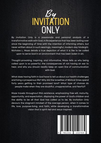 By Invitation Only is a passionate and personal analysis of a transformative walk with God. A life experience that has been boiling over since the beginning of time with the intention of informing others, but never written about in such searingly, meaningful, modern-day hindsight. Nicholas L. Maze details a true depiction of what it is like to be called upon to serve God in an environment that has been laden in sin. Thought-provoking, inspiring, and informative, Maze tells us why being called upon is so powerful, the consequences of not having an ear to hear, and why you should readily keep an open line of communication with God. What does having faith in God have to tell us about our health challenges and living a prosperous life? Why did the Israelites of Biblical times spend forty years getting to their promised land? What type of choices do people make when they are doubtful, unappreciative, and fearful? Maze travels throughout life's existence, emphasizing free will, maturity, opportunity, and expectation, displaying the power of God's children and the ability to be all that God has called us to be. By Invitation Only devours the stagnant mindset of the average person, when it comes to life, love, purpose-living, and faith, while developing a transformative vision that is spirit-led and Jesus-inspired.