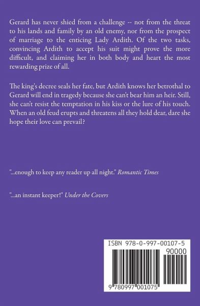 Gerard has never shied from a challenge -- not from the threat to his lands and family by an old enemy, nor from the prospect of marriage to the enticing Lady Ardith. Of the two tasks, convincing Ardith to accept his suit might prove the more difficult, and claiming her in both body and heart the most rewarding prize of all. The king's decree seals her fate, but Ardith knows her betrothal to Gerard will end in tragedy because she can't bear him an heir. Still, she can't resist the temptation in his kiss or the lure of his touch. When an old feud erupts and threatens all they hold dear, dare she hope that their love can prevail?