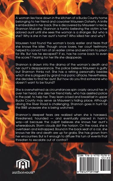 A woman lies face down in the kitchen of a Bucks County home belonging to her friend and coworker Maureen Doherty. A knife is embedded in her back. She is discovered by Maureen's niece, Shannon Mulcahy. Shannon is frantic believing the victim is her adored aunt until she sees the woman is a stranger. But who is she? Why is she in her aunt's home? Who killed her and why? Maureen had found the woman's body earlier and fears that she knows the killer. Though once lovers, her court testimony helped to convict him of an earlier crime and send him to prison for life. But has he escaped? If so, has he come back to even the score.? Fearing for her life she disappears. Shannon is drawn into the drama of the woman's death and her aunt's disappearance. The police believe Maureen is guilty but Shannon thinks not. She has a retiring personality besides which she is plagued by grand mal panic attacks. Nevertheless, she decides to find her aunt. But how do you find someone who doesn't want to be found? She is overwhelmed as circumstances spin crazily around her. In over her head, she asks her friend Kelly, who has assisted police in the past, to help her. They learn a bed and breakfast in upper Bucks County may serve as Maureen's hiding place. Although driving the River Road is challenging, Shannon goes in hunt for the B&B unaware she is being watched. Shannon's deepest fears are realized when she is harassed, threatened, hounded - and eventually placed in harm's way-all because the culprit believes she knows her aunt's whereabouts. Storm clouds dot the horizon. On the road, she is overtaken and kidnapped. Bound in the back seat of a car, she knows her life and death are up for grabs. She has grown from her encounters. But is it enough to diffuse this turn of events that threaten to escalate out of control?