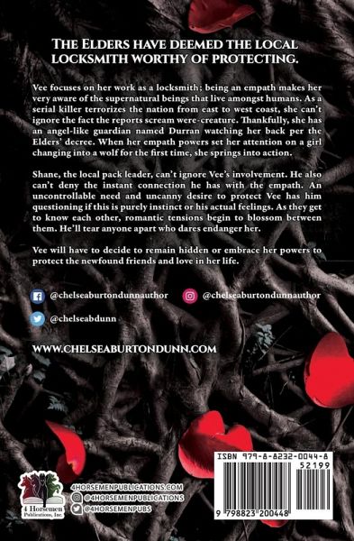The Elders have deemed the local locksmith worthy of protecting. Vee focuses on her work as a locksmith; being an empath makes her very aware of the supernatural beings that live amongst humans. As a serial killer terrorizes the nation from east to west coast, she can't ignore the fact the reports scream were-creature. Thankfully, she has an angel-like guardian named Durran watching her back per the Elders' decree. When her empath powers set her attention on a girl changing into a wolf for the first time, she springs into action. Shane, the local pack leader, can't ignore Vee's involvement. He also can't deny the instant connection he has with the empath. An uncontrollable need and uncanny desire to protect Vee has him questioning if this is purely instinct or his actual feelings. As they get to know each other, romantic tensions begin to blossom between them. He'll tear anyone apart who dares endanger her. Vee will have to decide to remain hidden or embrace her powers to protect the newfound friends and love in her life.