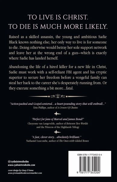 To live is Christ. To die is much more likely. Raised as a skilled assassin, the young and ambitious Sadie Black knows nothing else; her only way to live is for someone to die. Doing otherwise would betray her sole support network and leave her at the wrong end of a gun-which is exactly where Sadie has landed herself. Abandoning the life of a hired killer for a new life in Christ, Sadie must work with a self-reliant FBI agent and his cryptic superior to secure her freedom before a vengeful family can steal her back to the career she's desperately running from. Or they execute something a bit more...fatal. Filled with sarcasm and intrigue, this contemporary faith-based novel proves itself as a must-read for adventure-seeking teens and new adults.