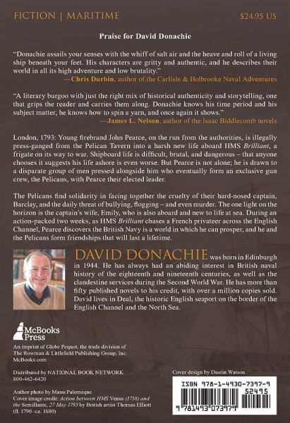 Volume #1 in the John Pearce Adventures. London, 1793: Young firebrand John Pearce, on the run from the authorities, is illegally press-ganged from the Pelican Tavern into brutal life aboard HMS Brilliant, a frigate on its way to war. Shipboard life is hard, brutal, and dangerous—that anyone chooses it suggests that life ashore is even worse. But Pearce is not alone; he is drawn to a disparate group of men pressed alongside him who eventually form an exclusive gun crew, the Pelicans, with Pearce their elected leader.