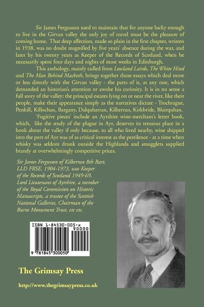 Sir James Fergusson used to maintain that for anyone lucky enough to live in the Girvan valley the only joy of travel must be the pleasure of coming home. That deep affection, made so plain in the first chapter, written in 1938, was no doubt magnified by five years' absence during the war, and later by his twenty years as Keeper of the Records of Scotland, when he necessarily spent four days and nights of most weeks in Edinburgh. This anthology, mainly culled from Lowland Lairds, The White Hind and The Man Behind Macbeth, brings together those essays which deal more or less directly with the Girvan valley - the parts of it, at any rate, which demanded an historian's attention or awoke his curiosity. It is in no sense a full story of the valley: the principal estates lying on or near the river, like their people, make their appearance simply as the narratives dictate - Trochrague, Penkill, Killochan, Bargany, Dalquharran, Kilkerran, Kirkbride, Blairquhan. 'Fugitive pieces' include an Ayrshire wine-merchant's letter book, which, like the study of the plague in Ayr, deserves its tenuous place in a book about the valley if only because, to all who lived nearby, wine shipped into the port of Ayr was of as critical interest as the pestilence - at a time when whisky was seldom drunk outside the Highlands and smugglers supplied brandy at overwhelmingly competitive prices. Sir James Fergusson of Kilkerran 8th Bart, LLD FRSE, 1904-1973, was Keeper of the Records of Scotland 1949-69, Lord Lieutenant of Ayrshire, a member of the Royal Commission on Historic Manuscripts, a trustee of the Scottish National Galleries, Chairman of the Burns Monument Trust, etc etc.