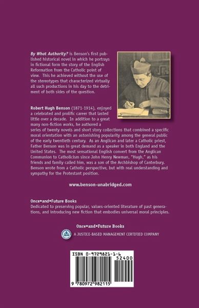 BY WHAT AUTHORITY? is Robert Hugh Benson's (1871-1914) first published historical novel. In it he portrays the story of the English Reformation in Elizabethan times from the Catholic point of view. This he achieved without the use of the stereotypes that characterized virtually all such productions in his day to the detriment of both sides of the question.
