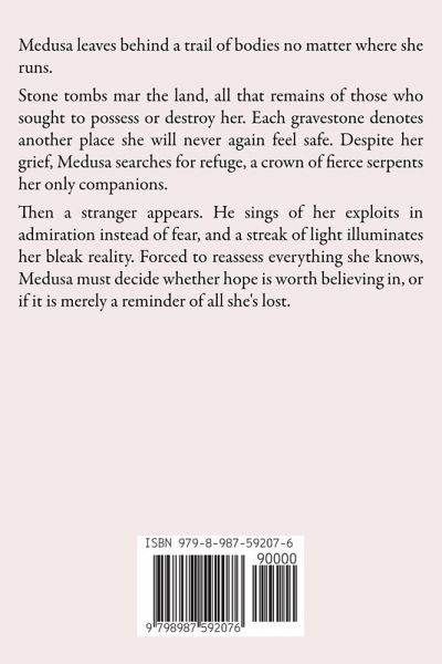 Medusa leaves behind a trail of bodies no matter where she runs. Stone tombs mar the land, all that remains of those who sought to possess or destroy her. Each gravestone denotes another place she will never again feel safe. Despite her grief, Medusa searches for refuge, a crown of fierce serpents her only companions. Then a stranger appears. He sings of her exploits in admiration instead of fear, and a streak of light illuminates her bleak reality. Forced to reassess everything she knows, Medusa must decide whether hope is worth believing in, or if it is merely a reminder of all she's lost.