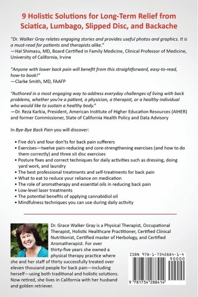 Holistic Solutions for Long-Term Relief from Sciatica, Lumbago, Slipped Disc, and Backache Whether you suffer from chronic low back pain or you’ve recently hurt your back, you will know how that pain affects your daily life. Bye-Bye Back Pain: 9 Holistic Solutions For Relief from Sciatica, Lumbago, Slipped Disc, and Backache was written for those who Suffer from chronic back pain and nagging discomfort that just won’t go away Have noticed a little nagging back pain and want to prevent a serious outbreak of pain Have seen multiple doctors, therapists, massage therapists, and chiropractors, and your pain is still there Want to decrease or stop taking painkillers for pain relief Have had an injury and want to learn new preventative techniques Have a loved one in pain and you want to guide them in their recovery Dr. Grace Walker Gray, a physical therapist, occupational therapist, holistic healthcare practitioner, certified clinical nutritionist, certified master of herbology, and certified aromatherapist, has treated over eleven thousand people for back pain—including herself—using both traditional and holistic solutions. Nine Proven Holistic Solutions Based on her extensive experience over thirty-five years as the owner of a large physical therapy practice where she and her staff of thirty successfully treated patients referred from over five hundred physicians, Dr. Walker Gray has identified nine proven holistic solutions to relieve your back pain without surgery or drugs. Much of her holistic approach can be self-administered at home, saving you both time and money. In Bye-Bye Back Pain you will discover: Five do’s and four don’ts for back pain sufferers Exercises—twelve pain-reducing and core-strengthening exercises (and how to do them correctly), and three sit disc exercises Posture fixes and correct techniques for daily activities such as dressing, doing yard work, and laundry The best professional treatments and self-treatments for back pain What to eat to reduce your reliance on medication The role of aromatherapy and essential oils in reducing back pain Low-level laser treatments The potential benefits of applying cannabidiol oil Mindfulness techniques you can use during daily activity Healthcare providers who are looking for new progressive holistic solutions to help reduce their patients’ low back pain and sciatica will also find a wealth of information in Bye-Bye Back Pain. If you have ever suffered from back pain, this is a must-have, must-read book. You, too, can soon say, Bye-Bye Back Pain. Begin reading now using Amazon’s "Look Inside" feature and order your Kindle or paperback copy today.