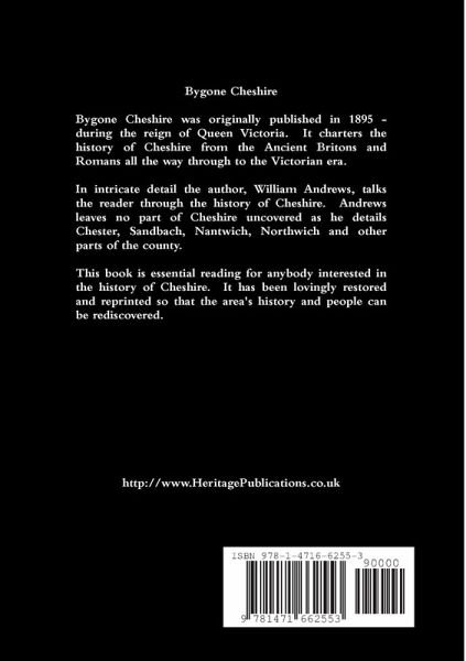 Bygone Cheshire Bygone Cheshire was originally published in 1895 - during the reign of Queen Victoria. It charters the history of Cheshire from the Ancient Britons and Romans all the way through to the Victorian era. In intricate detail the author, William Andrews, talks the reader through the history of Cheshire. Andrews leaves no part of Cheshire uncovered as he details Chester, Sandbach, Nantwich, Northwich and other parts of the county. This book is essential reading for anybody interested in the history of Cheshire. It has been lovingly restored and reprinted so that the area's history and people can be rediscovered. http://www.HeritagePublications.co.uk
