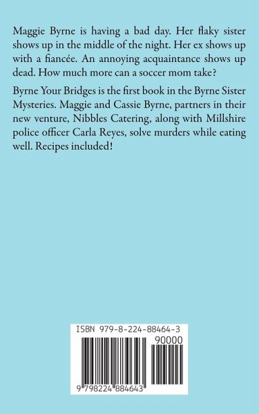 Maggie Byrne is having a bad day. Her flaky sister shows up in the middle of the night. Her ex shows up with a fiancée. An annoying acquaintance shows up dead. How much more can a soccer mom take? Byrne Your Bridges is the first book in the Byrne Sister Mysteries. Maggie and Cassie Byrne, partners in their new venture, Nibbles Catering, along with Millshire police officer Carla Reyes, solve murders while eating well. Recipes included!