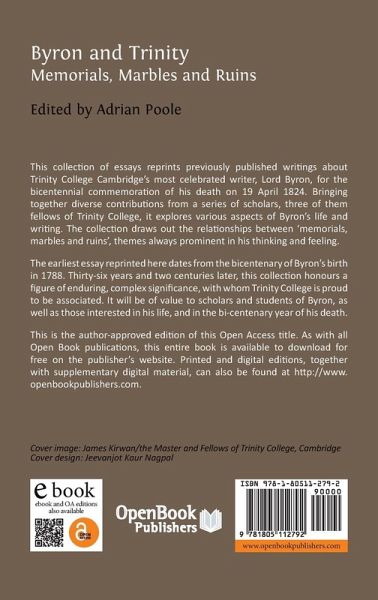 This collection of essays reprints previously published writings about Trinity College Cambridge's most celebrated writer, Lord Byron, for the bicentennial commemoration of his death on 19 April 1824. Bringing together diverse contributions from a series of scholars, three of them fellows of Trinity College, it explores various aspects of Byron's life and writing. The collection draws out the relationships between 'memorials, marbles and ruins', themes always prominent in his thinking and feeling. The earliest essay reprinted here dates from the bicentenary of Byron's birth in 1788. Thirty-six years and two centuries later, this collection honours a figure of enduring, complex significance, with whom Trinity College is proud to be associated. It will be of value to scholars and students of Byron, as well as those interested in his life, in the bi-centenary year of his death.