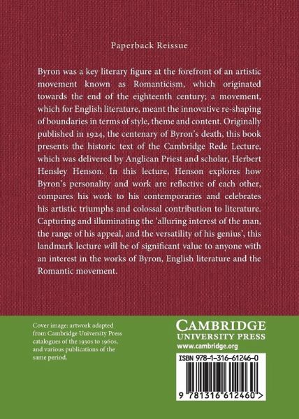 Byron was a key literary figure at the forefront of an artistic movement known as Romanticism, which originated towards the end of the eighteenth century; a movement which for English literature meant the innovative re-shaping of boundaries in terms of style, theme and content. Originally published in 1924, the centenary of Byron's death, this book presents the historic text of the Cambridge Rede Lecture, which was delivered by Anglican priest and scholar Herbert Hensley Henson. In this lecture, Henson explores how Byron's personality and work are reflective of each other, compares his work to his contemporaries and celebrates his artistic triumphs and colossal contribution to literature. Capturing and illuminating the 'alluring interest of the man, the range of his appeal, and the versatility of his genius', this landmark lecture will be of significant value to anyone with an interest in the works of Byron, English literature and the Romantic movement.