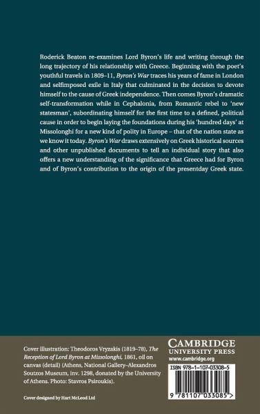 Roderick Beaton re-examines Lord Byron's life and writing through the long trajectory of his relationship with Greece. Beginning with the poet's youthful travels in 1809-1811, Beaton traces his years of fame in London and self-imposed exile in Italy, that culminated in the decision to devote himself to the cause of Greek independence. Then comes Byron's dramatic self-transformation, while in Cephalonia, from Romantic rebel to 'new statesman', subordinating himself for the first time to a defined, political cause, in order to begin laying the foundations, during his 'hundred days' at Missolonghi, for a new kind of polity in Europe - that of the nation-state as we know it today. Byron's War draws extensively on Greek historical sources and other unpublished documents to tell an individual story that also offers a new understanding of the significance that Greece had for Byron, and of Byron's contribution to the origin of the present-day Greek state.