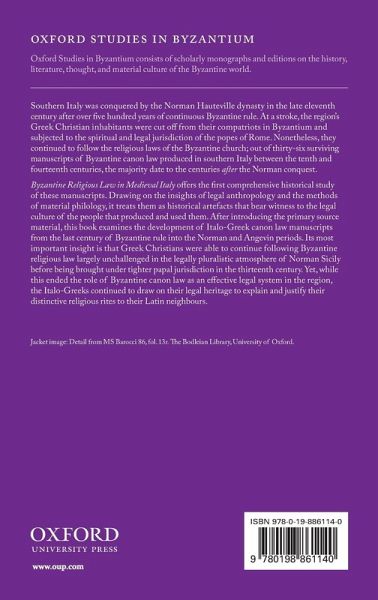 Byzantine Religious Law in Medieval Italy is a historical study of manuscripts containing Byzantine canon law produced after the Norman conquest of southern Italy, exploring how and why the Greek Christians of the region persisted in using them so long after the end of Byzantine rule.