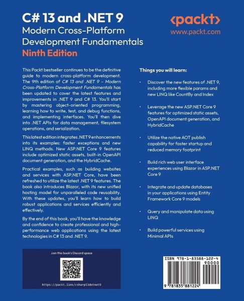 An accessible guide for beginner-to-intermediate programmers to the concepts, real-world applications, and latest features of C# 13 and .NET 9, with hands-on exercises using Visual Studio and Visual Studio Code Key Features: - Explore the newest additions to C# 13, the .NET 9 class libraries, and Entity Framework Core 9 - Build professional websites and services with ASP.NET Core 9 and Blazor - Enhance your skills with step-by-step code examples and best practices tips Book Description: This Packt bestseller continues to be the definitive guide to modern cross-platform development. The 9th edition of C# 13 and .NET 9 - Modern Cross-Platform Development Fundamentals has been updated to cover the latest features and improvements in .NET 9 and C# 13. You'll start by mastering object-oriented programming, learning how to write, test, and debug functions, and implementing interfaces. You'll then dive into .NET APIs for data management, filesystem operations, and serialization. This latest edition integrates .NET 9 enhancements into its examples: faster exceptions and new LINQ methods. New ASP.NET Core 9 features include optimized static assets, built-in OpenAPI document generation, and the HybridCache. Practical examples, such as building websites and services with ASP.NET Core, have been refreshed to utilize the latest .NET 9 features. The book also introduces Blazor, with its new unified hosting model for unparalleled code reusability. With these updates, you'll learn how to build robust applications and services efficiently and effectively. By the end of this book, you'll have the knowledge and confidence to create professional and high-performance web applications using the latest technologies in C# 13 and .NET 9. What You Will Learn: - Discover the new features of .NET 9, including more flexible params and new LINQ like CountBy and Index - Leverage the new ASP.NET Core 9 features for optimized static assets, OpenAPI document generation, and HybridCache - Utilize the native AOT publish capability for faster startup and reduced memory footprint - Build rich web user interface experiences using Blazor in ASP.NET Core 9 - Integrate and update databases in your applications using Entity Framework Core 9 models - Query and manipulate data using LINQ - Build powerful services using Minimal APIs Who this book is for: This book is aimed at beginner to intermediate-level C# and .NET developers. While prior exposure to C# or .NET is not a prerequisite, a general understanding of programming concepts will be beneficial. If you want to learn more technologies for building modern .NET projects like gRPC, SignalR, and .NET MAUI, read Mark's Apps and Services with .NET 8 book next; and if you aim to become a professional .NET developer quickly or mainly work on team projects, read his other book, Tools and Skills for .NET 8. Table of Contents - Hello, C#! Welcome, .NET! - Speaking C# - Controlling Flow, Converting Types, and Handling Exceptions - Writing, Debugging, and Testing Functions - Building Your Own Types with Object-Oriented Programming - Implementing Interfaces and Inheriting Classes - Packaging and Distributing .NET Types - Working with Common .NET Types - Working with Files, Streams, and Serialization (N.B. Please use the Read Sample option to see further chapters)<