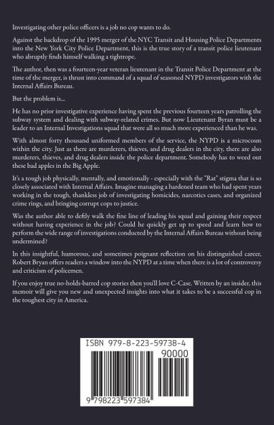 Investigating other police officers is a job no cop wants to do. Against the backdrop of the 1995 merger of the NYC Transit and Housing Police Departments into the New York City Police Department, this is the true story of a transit police lieutenant who abruptly finds himself walking a tightrope. The author, then was a fourteen-year veteran lieutenant in the Transit Police Department at the time of the merger, is thrust into command of a squad of seasoned NYPD investigators with the Internal Affairs Bureau. But the problem is... He has no prior investigative experience having spent the previous fourteen years patrolling the subway system and dealing with subway-related crimes. But now Lieutenant Byran must be a leader to an Internal Investigations squad that were all so much more experienced than he was. With almost forty thousand uniformed members of the service, the NYPD is a microcosm within the city. Just as there are murderers, thieves, and drug dealers in the city, there are also murderers, thieves, and drug dealers inside the police department. Somebody has to weed out these bad apples in the Big Apple. It's a tough job physically, mentally, and emotionally - especially with the "Rat" stigma that is so closely associated with Internal Affairs. Imagine managing a hardened team who had spent years working in the tough, thankless job of investigating homicides, narcotics cases, and organized crime rings, and bringing corrupt cops to justice. Was the author able to deftly walk the fine line of leading his squad and gaining their respect without having experience in the job? Could he quickly get up to speed and learn how to perform the wide range of investigations conducted by the Internal Affairs Bureau without being undermined? In this insightful, humorous, and sometimes poignant reflection on his distinguished career, Robert Bryan offers readers a window into the NYPD at a time when there is a lot of controversy and criticism of policemen. If you enjoy true no-holds-barred cop stories then you'll love C-Case. Written by an insider, this memoir will give you new and unexpected insights into what it takes to be a successful cop in the toughest city in America.