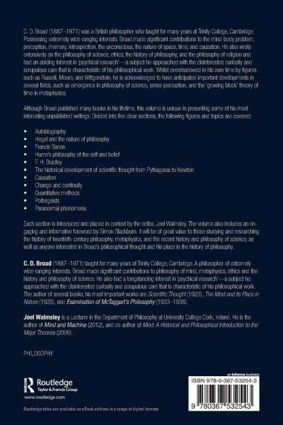 Each section is introduced and placed in context by the editor, Joel Walmsley. The volume also includes an engaging and informative foreword by Simon Blackburn. It will be of great value to those studying and researching the history of twentieth-century philosophy, metaphysics, and the recent history and philosophy of science, as well as anyone interested in Broad's philosophical thought and his place in the history of philosophy.