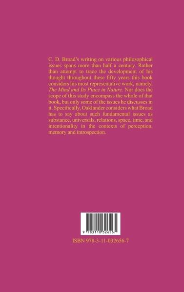 C. D. Broad's writing on various philosophical issues spans more than half a century. Rather than attempt to trace the development of his thought throughout these fifty years this book considers his most representative work, namely, The Mind and Its Place in Nature. Nor does the scope of this study encompass the whole of that book, but only some of the issues he discusses in it. Specifically, Oaklander considers what Broad has to say about such fundamental issues as substance, universals, relations, space, time, and intentionality in the contexts of perception, memory and introspection. L. Nathan Oaklander studied philosophy at the university of Iowa. He is a student of Gustav Bergmann, one of the most distinguished ontologist in 20th century philosophy.