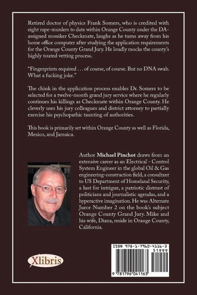 Retired doctor of physics Frank Somers, who is credited with eight rape-murders to date within Orange County under the DA-assigned moniker Checkmate, laughs as he turns away from his home office computer after studying the application requirements for the Orange County Grand Jury. He loudly mocks the county's highly touted vetting process. "Fingerprints required . . . of course, of course. But no DNA swab. What a fucking joke." The chink in the application process enables Dr. Somers to be selected for a twelve-month grand jury service where he regularly continues his killings as Checkmate within Orange County. He cleverly uses his jury colleagues and district attorney to partially exercise his psychopathic taunting of authorities. This book is primarily set within Orange County as well as Florida, Mexico, and Jamaica.