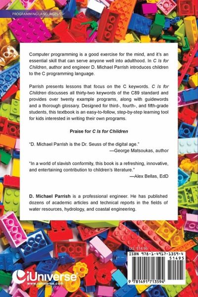 Computer programming is a good exercise for the mind, and it’s an essential skill that can serve anyone well into adulthood. In C Is for Children, author and engineer D. Michael Parrish introduces children to the C programming language. Parrish presents lessons that focus on the C keywords. C Is for Children discusses all thirty-two keywords of the C89 standard andprovides over twenty example programs, along with guidewordsand a thorough glossary. Designed for third-, fourth-, and fifth-gradestudents, this textbook is an easy-to-follow, step-by-step learning toolfor kids interested in writing their own programs. Praise for C Is for Children "D. Michael Parrish is the Dr. Seuss of the digital age." —George Matsoukas, author "In a world of slavish conformity, this book is a refreshing, innovative, and entertaining contribution to children’s literature." —Alex Bellas, EdD