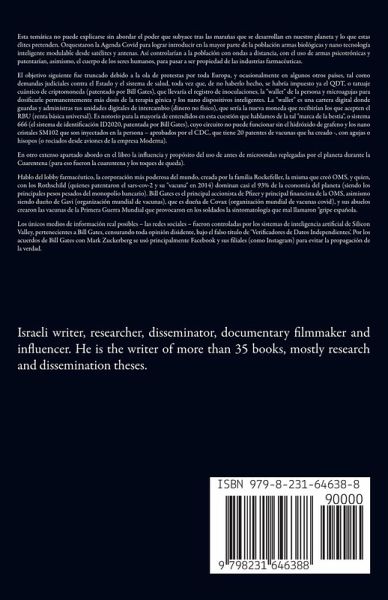 Esta temática no puede explicarse sin abordar el poder que subyace tras las marañas que se desarrollan en nuestro planeta y lo que estas élites pretenden. Orquestaron la Agenda Covid para lograr introducir en la mayor parte de la población armas biológicas y nano tecnología inteligente modulable desde satélites y antenas. Así controlarían a la población con ondas a distancia, con el uso de armas psicotrónicas y patentarían, asimismo, el cuerpo de los seres humanos, para pasar a ser propiedad de las industrias farmacéuticas. El objetivo siguiente fue truncado debido a la ola de protestas por toda Europa, y ocasionalmente en algunos otros países, tal como demandas judiciales contra el Estado y el sistema de salud, toda vez que, de no haberlo hecho, se habría impuesto ya el QDT, o tatuaje cuántico de criptomoneda (patentado por Bill Gates), que llevaría el registro de inoculaciones, la "wallet" de la persona y microagujas para dosificarle permanentemente más dosis de la terapia génica y los nano dispositivos inteligentes. La "wallet" es una cartera digital donde guardas y administras tus unidades digitales de intercambio (dinero no físico), que sería la nueva moneda que recibirían los que acepten el RBU (renta básica universal). Es notorio para la mayoría de entendidos en esta cuestión que hablamos de la tal "marca de la bestia", o sistema 666 (el sistema de identificación ID2020, patentada por Bill Gates), cuyo circuito no puede funcionar sin el hidróxido de grafeno y los nano cristales SM102 que son inyectados en la persona - aprobados por el CDC, que tiene 20 patentes de vacunas que ha creado -, con agujas o hisopos (o rociados desde aviones de la empresa Moderna). En otro extenso apartado abordo en el libro la influencia y propósito del uso de antes de microondas replegadas por el planeta durante la Cuarentena (para eso fueron la cuarentena y los toques de queda). Hablo del lobby farmacéutico, la corporación más poderosa del mundo, creada por la familia Rockefeller, la misma que creó OMS, y quien, con los Rothschild (quienes patentaron el sars-cov-2 y su "vacuna" en 2014) dominan casi el 93% de la economía del planeta (siendo los principales pesos pesados del monopolio bancario). Bill Gates es el principal accionista de Pfizer y principal financista de la OMS, asimismo siendo dueño de Gavi (organización mundial de vacunas), que es dueña de Covax (organización mundial de vacunas covid), y sus abuelos crearon las vacunas de la Primera Guerra Mundial que provocaron en los soldados la sintomatología que mal llamaron "gripe española. Los únicos medios de información real posibles - las redes sociales - fueron controladas por los sistemas de inteligencia artificial de Silicon Valley, pertenecientes a Bill Gates, censurando toda opinión disidente, bajo el falso título de 'Verificadores de Datos Independientes'. Por los acuerdos de Bill Gates con Mark Zuckerberg se usó principalmente Facebook y sus filiales (como Instagram) para evitar la propagación de la verdad.