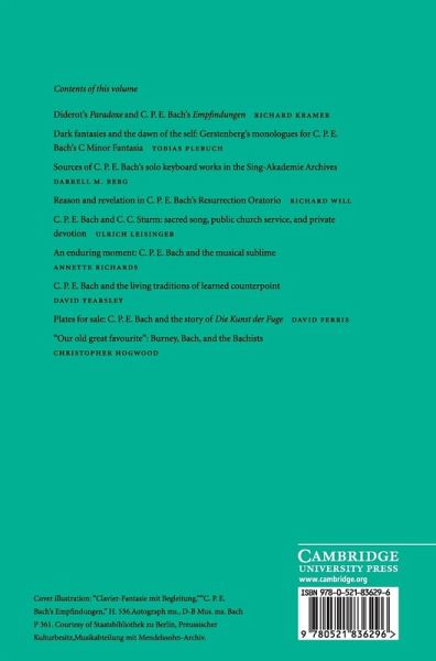 Introduction; 1. Diderot's Paradoxe and C. P. E. Bach's Empfindungen Richard Kramer; 2. Dark fantasies and the dawn of the self: Gerstenberg's monologues for C. P. E. Bach's C Minor Fantasia Tobias Plebuch; 3. Sources of C. P. E. Bach's solo keyboard works in the Sing-Akademie archives Darrell M. Berg; 4. Reason and revelation in C. P. E. Bach's Resurrection Oratorio Richard Will; 5. C. P. E. Bach and C. C. Sturm: sacred song, public church service, and private devotion Ulrich Leisinger; 6. An enduring moment: C. P. E. Bach and the musical sublime Annette Richards; 7. C. P. E. Bach and the living traditions of learned counterpoint David Yearsley; 8. Plates for sale: C. P. E. Bach and the story of Die Kunst der Fuge David Ferris; 10. 'Our old great favourite': Burney, Bach and the Bachists Christopher Hogwood.
