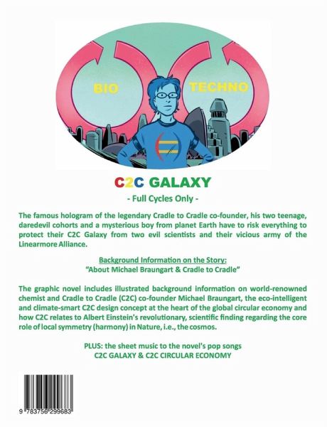 The famous hologram of the legendary Cradle to Cradle co-founder, his two teenage, daredevil cohorts and a mysterious boy from planet Earth have to risk everything to protect their C2C Galaxy from two evil scientists and their vicious army of the Linearmore Alliance. The graphic novel includes illustrated background information on world-renowned chemist and Cradle to Cradle (C2C) co-founder Michael Braungart, the eco-intelligent and climate-smart C2C design concept at the heart of the global circular economy and how C2C relates to Albert Einstein's revolutionary, scientific finding regarding the core role of local symmetry (harmony) in Nature, i.e., the cosmos. PLUS: the sheet music to the novel's pop songs C2C GALAXY & C2C CIRCULAR ECONOMYNOTE: This is the version of the graphic novel with interior pages in black and white.