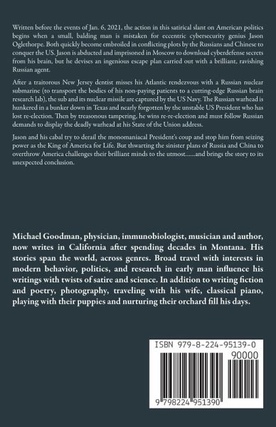 Written before the events of Jan. 6, 2021, the action in this satirical slant on American politics begins when a small, balding man is mistaken for eccentric cybersecurity genius Jason Oglethorpe. Both quickly become embroiled in conflicting plots by the Russians and Chinese to conquer the US. Jason is abducted and imprisoned in Moscow to download cyberdefense secrets from his brain, but he devises an ingenious escape plan carried out with a brilliant, ravishing Russian agent. After a traitorous New Jersey dentist misses his Atlantic rendezvous with a Russian nuclear submarine (to transport the bodies of his non-paying patients to a cutting-edge Russian brain research lab), the sub and its nuclear missile are captured by the US Navy. The Russian warhead is hunkered in a bunker down in Texas and nearly forgotten by the unstable US President who has lost re-election. Then by treasonous tampering, he wins re-re-election and must follow Russian demands to display the deadly warhead at his State of the Union address. Jason and his cabal try to derail the monomaniacal President's coup and stop him from seizing power as the King of America for Life. But thwarting the sinister plans of Russia and China to overthrow America challenges their brilliant minds to the utmost......and brings the story to its unexpected conclusion.