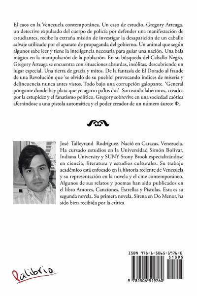 El caos en la Venezuela contemporánea. Un caso de estudio. Gregory Arteaga, un detective expulsado del cuerpo de policía por defender una manifestación de estudiantes, recibe la extraña misión de investigar la desaparición de un caballo salvaje utilizado por el aparato de propaganda del gobierno. Un animal que según algunos sabe leer y tiene la inteligencia necesaria para guiar una nación. Una bala mágica en la manipulación de la población. En su búsqueda del Caballo Negro, Gregory Arteaga se encuentra con situaciones absurdas, insólitas, descubriendo un lugar especial. Una tierra de gracia y mitos. De la fantasía de El Dorado al fraude de una Revolución que ‘se olvidó de su pueblo’ provocando índices de miseria y delincuencia nunca antes vistos. Todo bajo una corrupción galopante. ‘General póngame donde hay plata que yo agarro pa’los dos’. Sorteando laberintos, creados por la estupidez y el fanatismo político, Gregory sobrevive en una sociedad caótica aferrándose a una pistola automática y el poder creador de un número áureo: Φ.