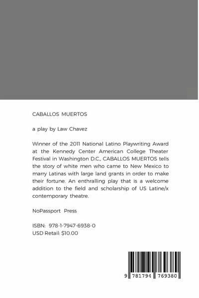 CABALLOS MUERTOS by Law Chavez. Winner of the 2011 National Latino Playwriting Award at the Kennedy Center American College Theater Festival in Washington D.C., CABALLOS MUERTOS tells the story of white men who came to New Mexico to marry Latinas with large land grants in order to make their fortune. An enthralling play that is a welcome addition to the field and scholarship of US Latine/x contemporary theatre. This is a NoPassport Press publication.