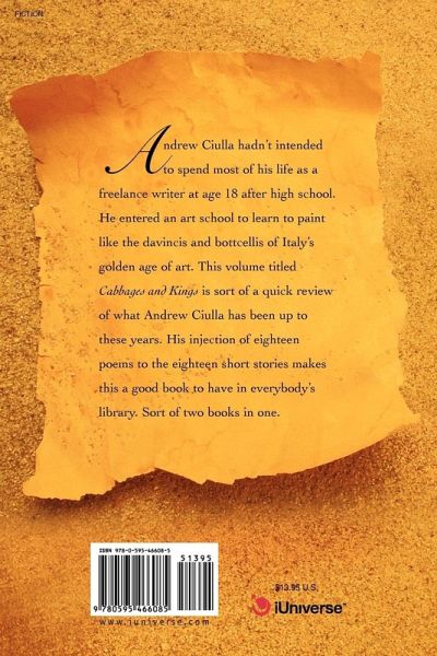 Andrew Ciulla hadn't intended to spend most of his life as a freelance writer at age 18 after high school. He entered an art school to learn to paint like the davincis and bottcellis of Italy's golden age of art. This volume titled Cabbages and Kings is sort of a quick review of what Andrew Ciulla has been up to these years. His injection of eighteen poems to the eighteen short stories makes this a good book to have in everybody's library. Sort of two books in one.