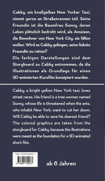 Cabby, ein knallgelbes New Yorker Taxi, nimmt gerne an Straßenrennen teil. Seine Freundin ist die Baumfrau Sunny, deren Leben plötzlich bedroht wird, als Ameisen, die Bewohner von New York City, sie fällen wollen. Wird es Cabby gelingen, seine liebste Freundin zu retten?Die farbigen Darstellungen sind dem Storyboard zu Cabby entnommen, da die Illustrationen als Grundlage für einen 3D-animierten Kurzfilm konzipiert wurden.Cabby, a bright yellow New York taxi, loves street races. His friend is a tree woman named Sunny, whose life is threatened when the ants, who inhabit New York, want to cut her down. Will Cabby be able to save his dearest friend?The colored graphics are taken from the storyboard for Cabby, because the illustrations were meant as the foundation for a 3D-animated short film.