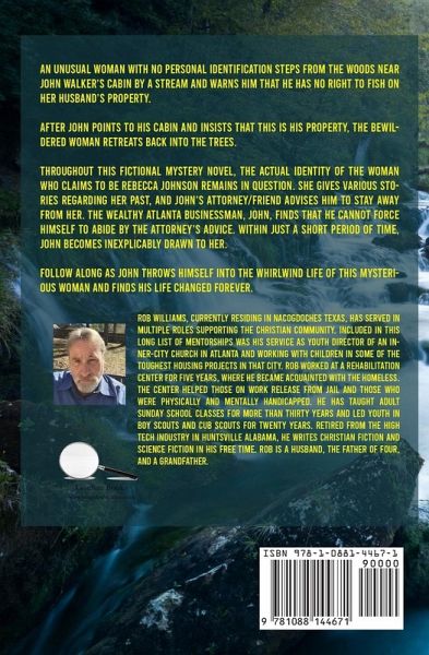 An unusual woman with no personal identification steps from the woods near John Walker's cabin by a stream and warns him that he has no right to fish on her husband's property. After John points to his cabin and insists that this is his property, the bewildered woman retreats back into the trees. Throughout this fictional mystery novel, the actual identity of the woman who claims to be Rebecca Johnson remains in question. She gives various stories regarding her past, and John's attorney/friend advises him to stay away from her. The wealthy Atlanta businessman, John, finds that he cannot force himself to abide by the attorney's advice. Within just a short period of time, John becomes inexplicably drawn to her. Follow along as John throws himself into the whirlwind life of this mysterious woman and finds his life changed forever.
