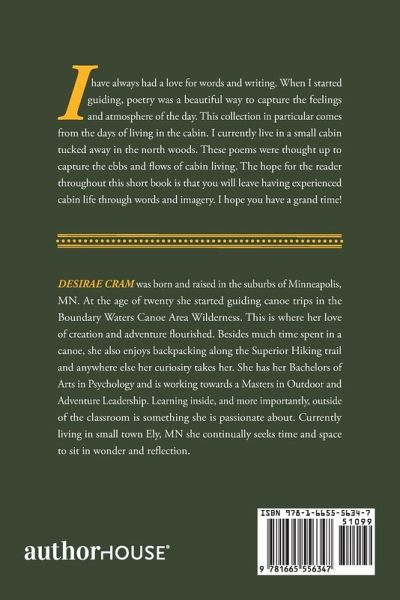 I have always had a love for words and writing. When I started guiding, poetry was a beautiful way to capture the feelings and atmosphere of the day. This collection in particular comes from the days of living in the cabin. I currently live in a small cabin tucked away in the north woods. These poems were thought up to capture the ebbs and flows of cabin living. The hope for the reader throughout this short book is that you will leave having experienced cabin life through words and imagery. I hope you have a grand time!