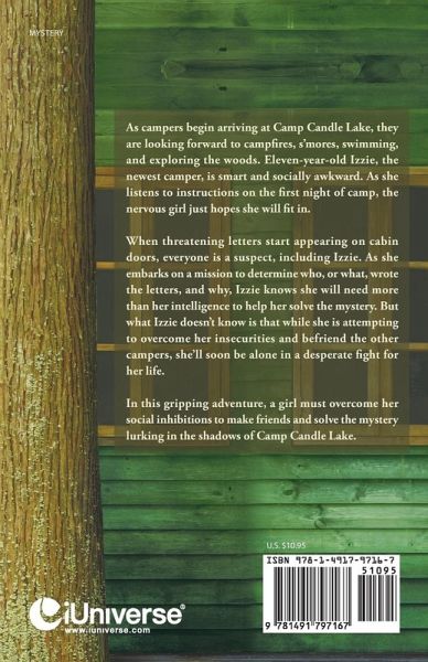 As campers begin arriving at Camp Candle Lake, they are looking forward to camp res, s'mores, swimming, and exploring the woods. Eleven-year-old Izzie, the newest camper, is smart and socially awkward. As she listens to instructions on the first night of camp, the nervous girl just hopes she will fit in. When threatening letters start appearing on cabin doors, everyone is a suspect, including Izzie. As she embarks on a mission to determine who, or what, wrote the letters, Izzie knows she will need more than her intelligence to help her solve the mystery. But what Izzie doesn't know is that while she is attempting to overcome her insecurities and befriend the other campers, she'll soon be alone in a desperate fight for her life. In this gripping adventure, a girl must overcome her social inhibitions to make friends and solve the mystery lurking in the shadows of Camp Candle Lake.