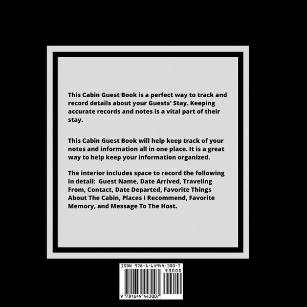 This beautiful Cabin Guest Book is perfect for your guests to sign as they stay at your cabin and welcome them in style. Great for Airbnb, Rentals, Lake House, Beach House, Hotel, Cabins, Vacation Rental, Bed and Breakfast, VRBO, Mountain Home Away, and more. Each interior page includes prompts and space to record the following: Guest Name - Names of your visitors. Date Arrived - Dates of their arrival. Traveling From - Where did they travel from. Contact - Write their address, email, phone number. Date Departed - Dates of their departure. Favorite Things About The Cabin - Space for them to write what they liked best about the cabin. Places I Would Recommend - Your guests can write their recommendations such as restaurants, shopping, entertainment, etc. Favorite Memory From Your Stay - A place for your guests to write their favorite memory. Message To The Host - Blank lined notes for them to leave a comment or message for the host. Will also make a great keepsake gift for anyone who owns rental cabins. Simple and easy to use. Rustic design. Size is 8.5x8.5 inches, 104 pages, soft matte finish cover, white paper, black ink, paperback.