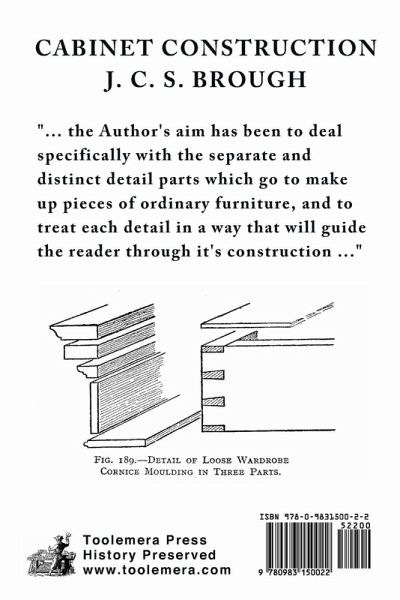 "This book deals exhaustively and in a thoroughly practical way with all methods of cabinet construction. Each detail is treated in a way that will guide the reader through it's construction in any size and in any style. The volume enables the woodworker to tackle successfully any design of which he has the scale drawings or even the dimensional sketch. Fully illustrated with over 300 drawings." THE WOODWORKER SERIES, Evans Bros., London, c1930. The third in the TOOLEMERA PRESS reprints from THE WOODWORKER SERIES, CABINET CONSTRUCTION describes the making of household furnishings basic, intermediate and advanced.