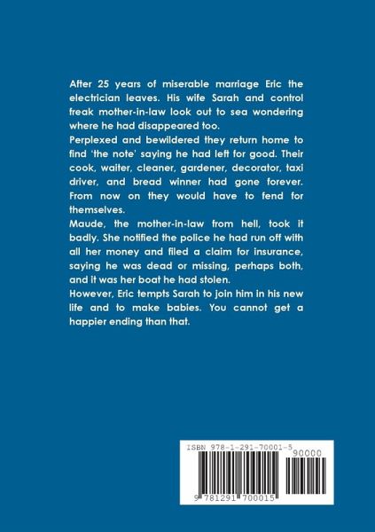 After 25 years of miserable marriage Eric the electrician leaves. His wife Sarah and control freak mother-in-law look out to sea wondering where he had disappeared too. Perplexed and bewildered they return home to find 'the note' saying he had left for good. Their cook, waiter, cleaner, gardener, decorator, taxi driver, and bread winner had gone forever. From now on they would have to fend for themselves. Maude, the mother-in-law from hell, took it badly. She notified the police he had run off with all her money and filed a claim for insurance, saying he was dead or missing, perhaps both, and it was her boat he had stolen. However, Eric tempts Sarah to join him in his new life and to make babies. You cannot get a happier ending than that.