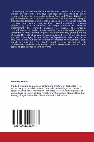 Cacao crop grows well on the countries between 20o north and 20o south latitude on the earth. Nowadays, Indonesia becomes the third largest producer of cacao in the world after Ivory Coast and Ghana. Actually, the global market of cocoa products encounters critical issues regarding to products standardization and seedling sustainability. The global chocolate companies tend to start using certified cocoa for variety of chocolate products by 2020. It enforces the origin countries to anticipate implementing the defined standard to increase the products competitiveness. In parallel, it was revealed, the somatic embryogenesis is considered as more superior to generative based seedling, grafting and slip of plants. The yield of somatic embryogenesis seed tends to increase along with the plants ages. So, the somatic embryogenesis based cacao is not only true to type, but also more superior compared to conventional seeds globally in this time. This book should be especially intended to professionals, students, academician, policy makers who consider cacao bean and cocoa products in their works.